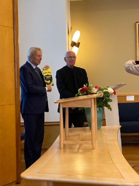 Dick Hollander overhandigt het boek aan interim burgemeester Peter den Oudsten